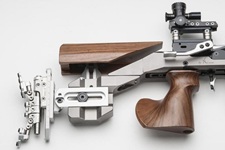 Bauteile Modell TOP: Diopter Centra Spy Short, Korntunnel Centra Score M22, Schaftkappe Pardini, neuer Handschaft aus Ergal und Holz mit Innen- und Außengewichteset (10), Gewichteset für Schaftbacke (3) und Korntunnelhalter (10).